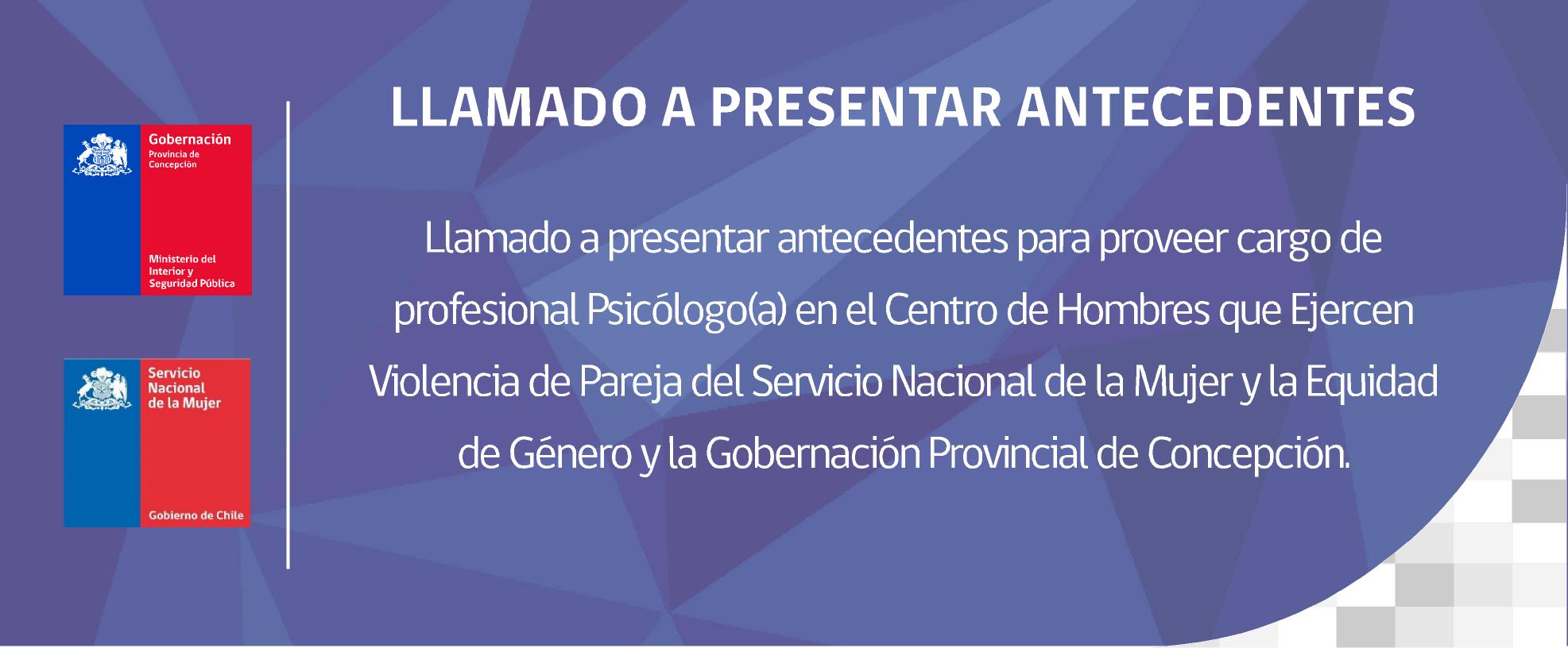 Llamado a presentar antecedentes para proveer cargo de profesional Psicólogo en el Centro de Hombres que Ejercen Violencia de Pareja del Servicio Nacional de la Mujer y la Equidad de Género y la Gobernación Provincial de Concepción.